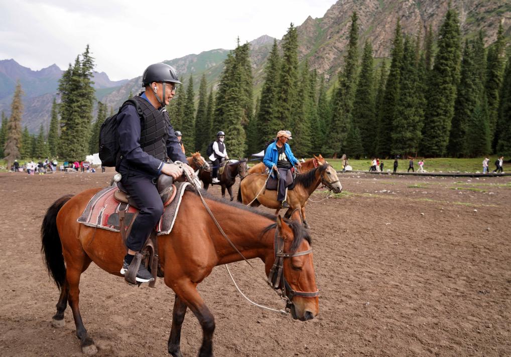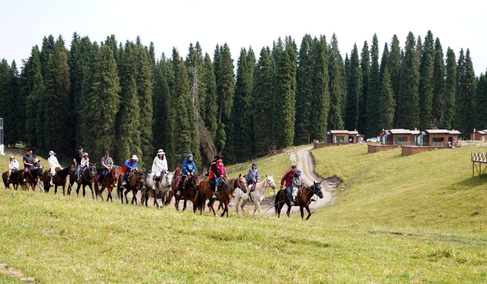 7月30日,游客在新疆伊犁哈薩克自治州昭蘇縣夏塔景區騎馬。新華社記者 趙宇思 攝