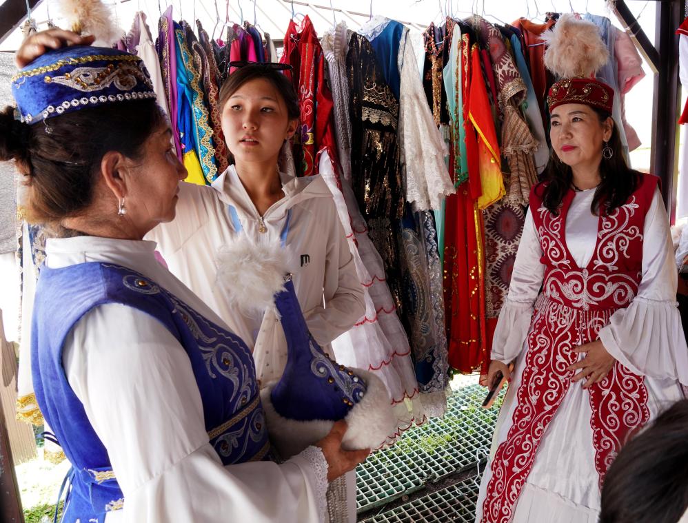8月3日,在新疆伊犁哈薩克自治州新源縣那拉提景區,游客在試穿民族服飾。新華社記者 劉蓮芬 攝