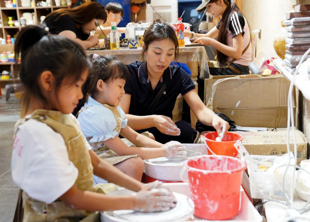 8月4日,在新疆伊犁哈薩克自治州伊寧市六星街,兩名小游客在體驗陶藝製作。新華社記者 劉蓮芬 攝