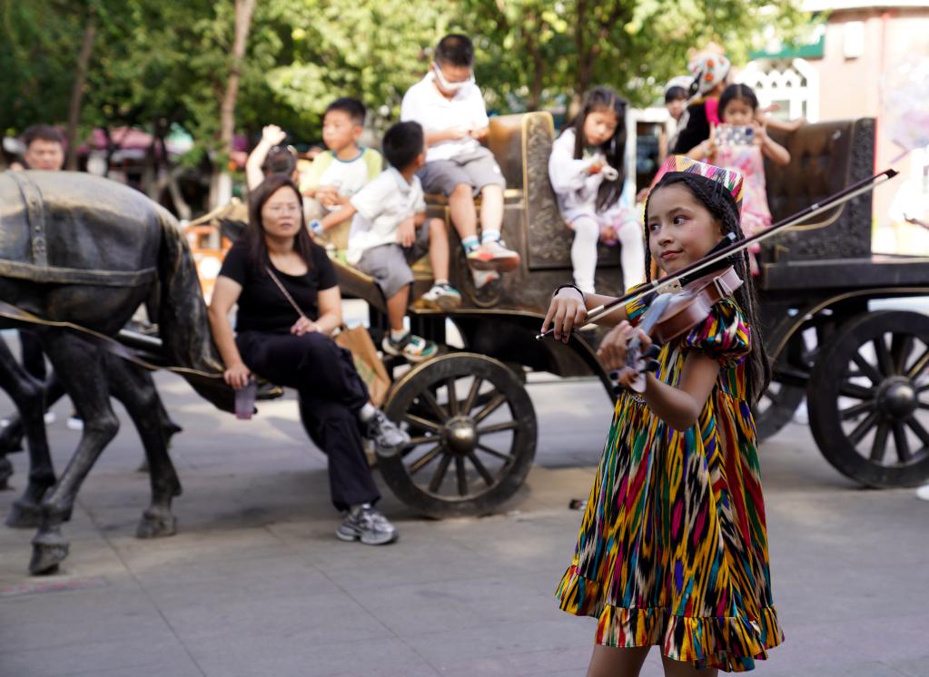 8月4日,在新疆伊犁哈薩克自治州伊寧市六星街,一名維吾爾族小女孩為游客演奏。新華社記者 趙宇思 攝