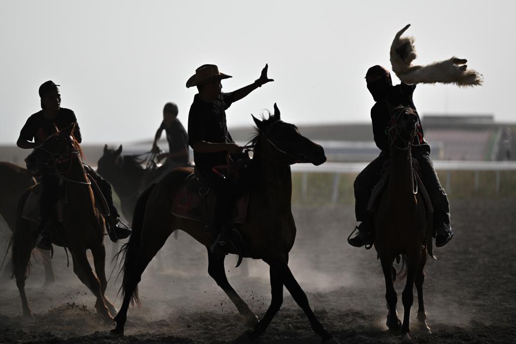 7月29日,騎手在新疆伊犁哈薩克自治州昭蘇縣天馬旅游文化園表演叼羊。新華社記者 辛悅衛 攝