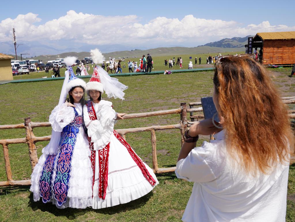 8月3日,在新疆伊犁哈薩克自治州新源縣那拉提景區,兩名游客身着民族服飾合影留念。新華社記者 趙宇思 攝