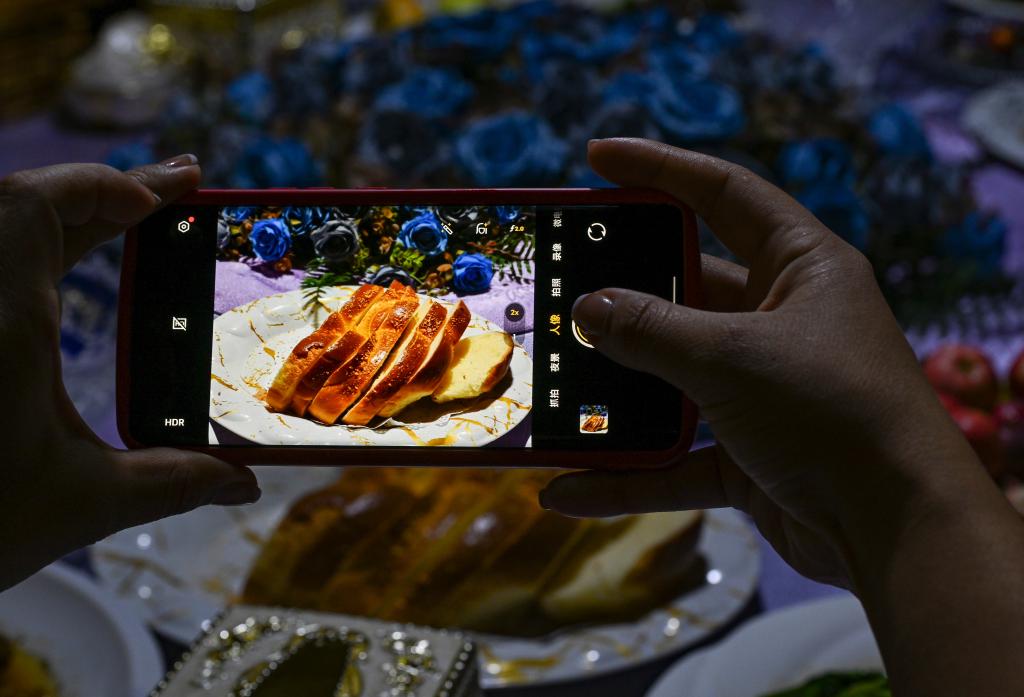 9月17日,一名客人在拍攝塔城地區特色的俄式風味大列巴。