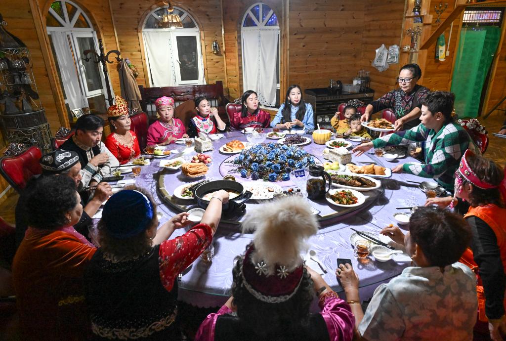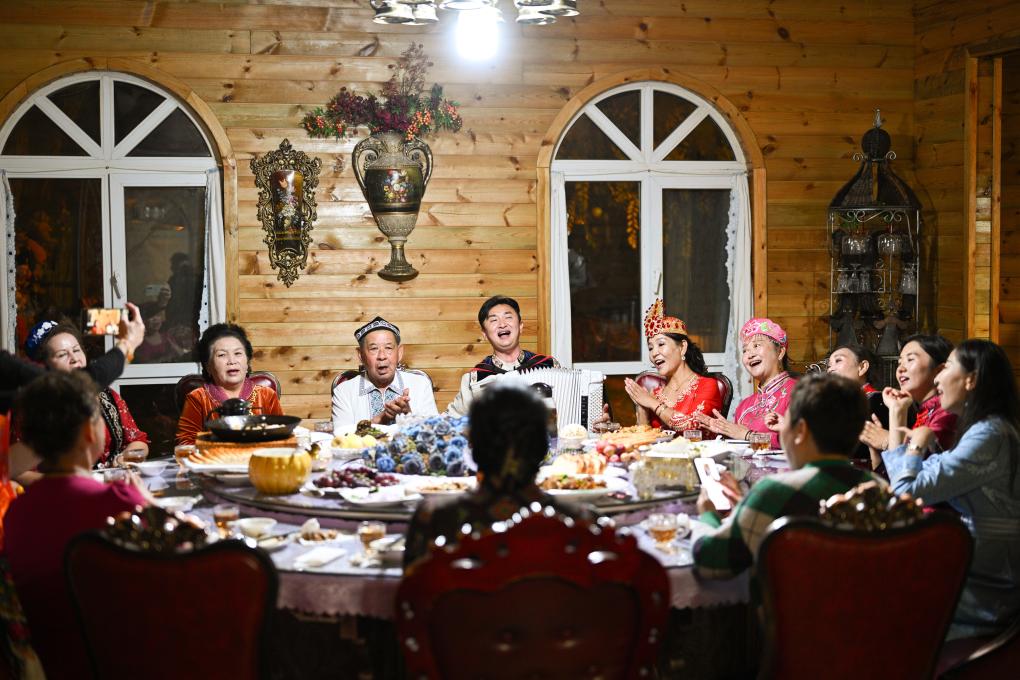 朋友們穿着民族服飾來到“朋友莊園”,馬大姐招呼大家進屋就坐。親朋好友拉着家常,品嘗着馬大姐的拿手菜和小院裏結的新鮮水果。房間裏飄揚起歡快的歌聲,不同民族的親友們在房間裏共舞。