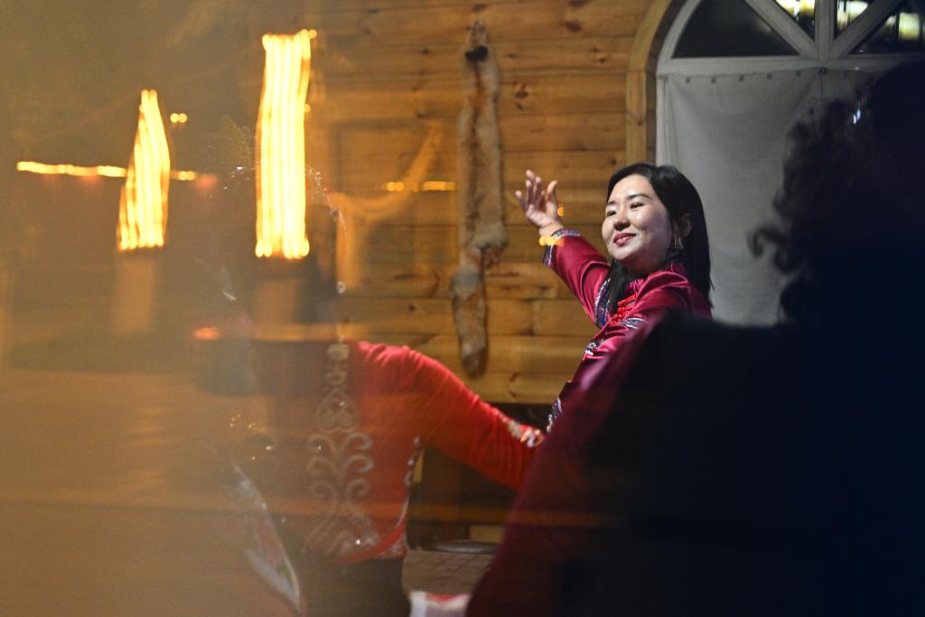 9月17日,達斡爾族客人宋瑞琪在餐後跳舞。