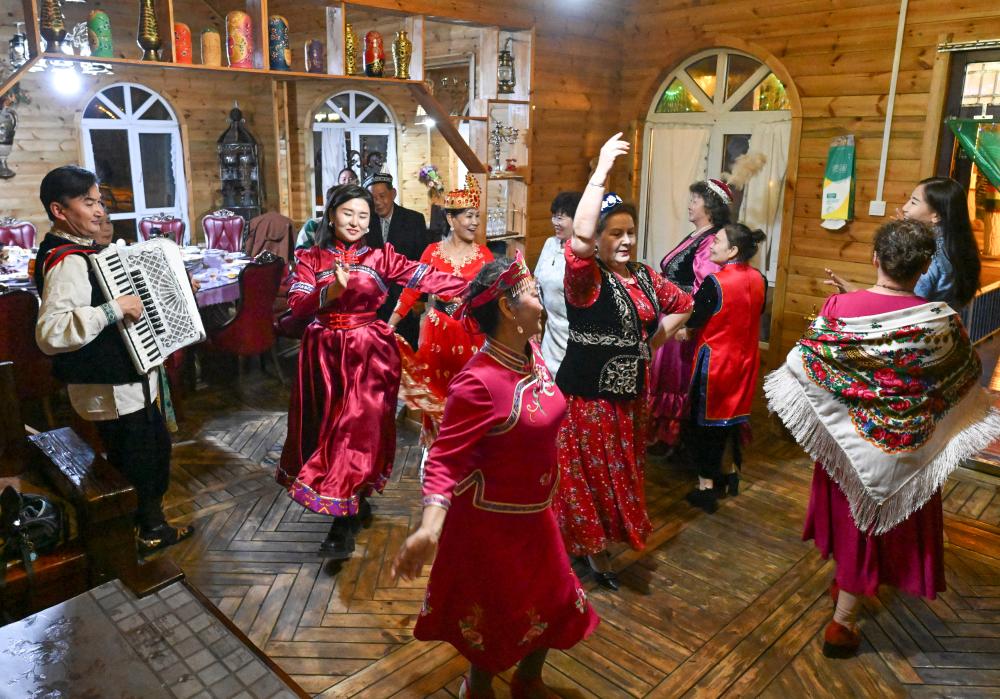 9月17日,哈薩克族客人哈加依甫·也克斯漢在餐後拉起手風琴,人們隨琴聲起舞。
