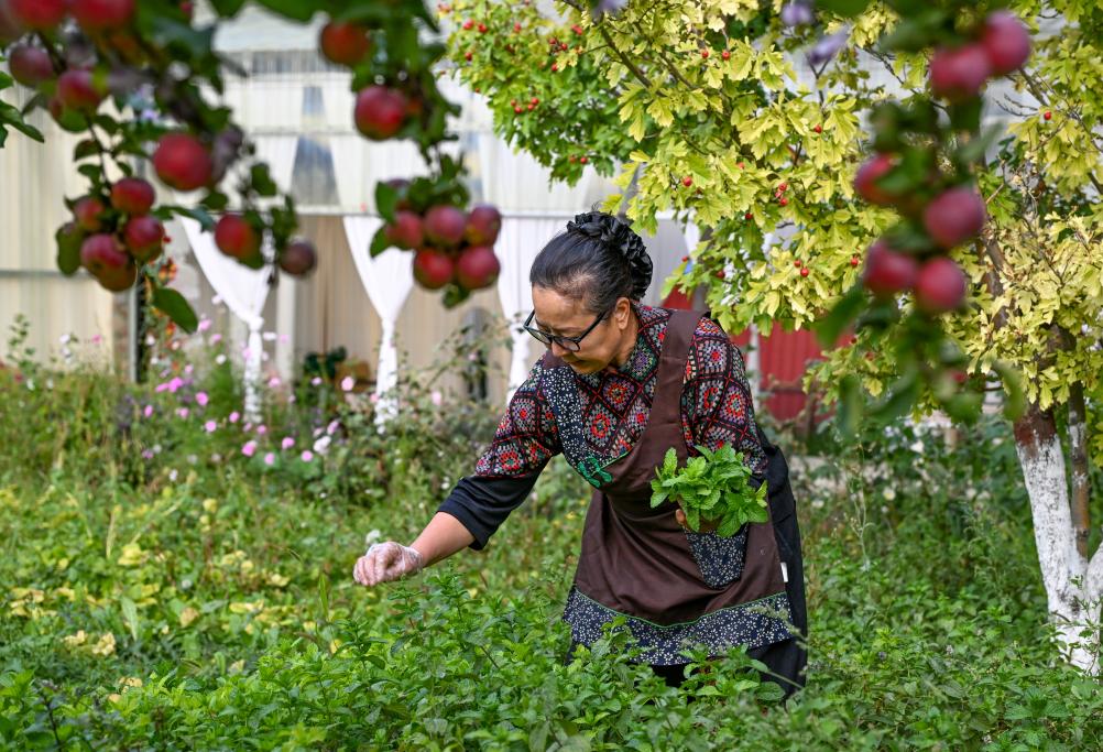 9月17日,馬秀花在菜園裏採摘薄荷,用於製作薄荷茶。