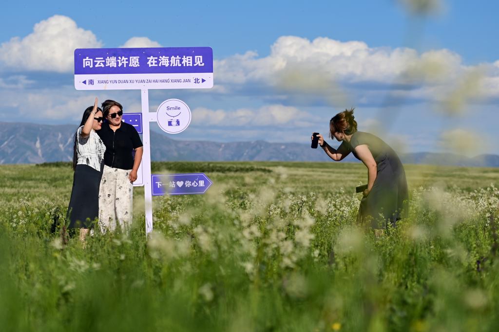 在新疆塔城地區額敏縣海航草原風景區,游客打卡拍照(5月30日攝)。