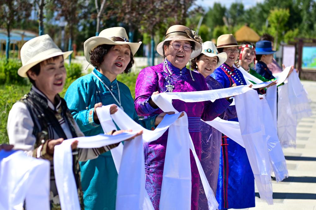 在新疆塔城地區額敏縣額瑪勒郭楞蒙古民族鄉恰爾格阿吉爾幹村“水墨青灣”田園,村民歡迎遠方來客(5月30日攝)。