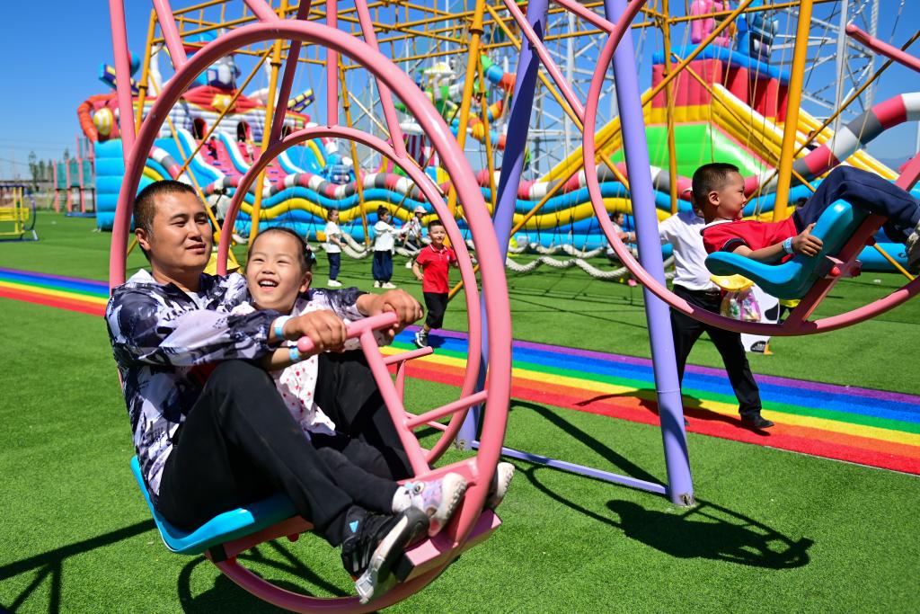 在新疆塔城地區額敏縣郊區鄉甘泉村,家長帶着孩子在花海無動力樂園游玩(5月30日攝)。