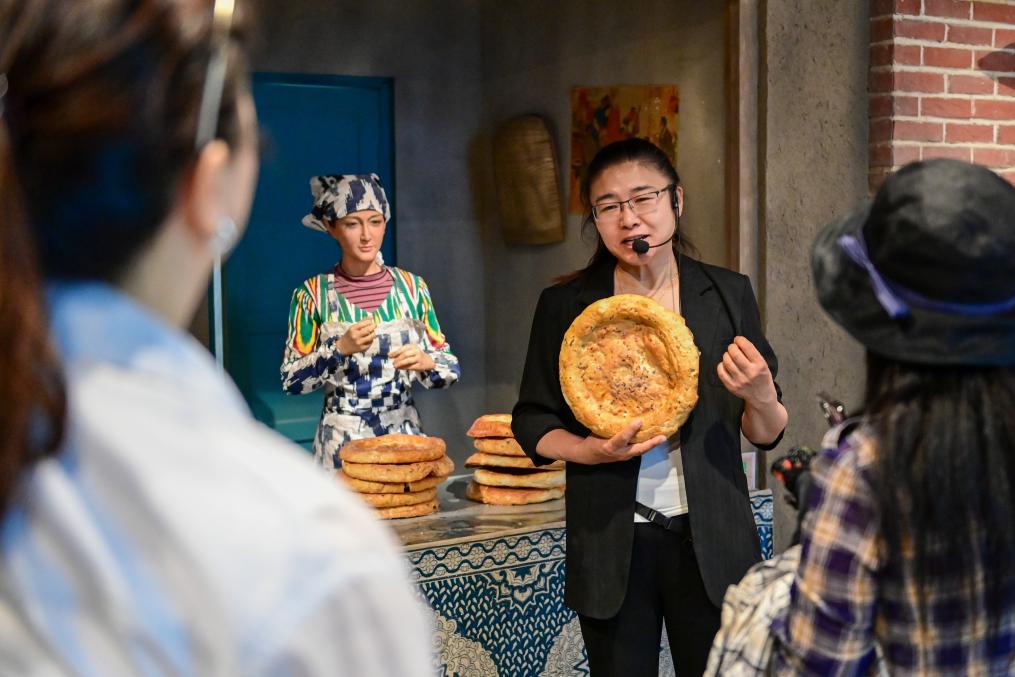 在新疆塔城地區額敏縣文化旅游品牌街巷——榆柳巷,游客在額敏記憶館參觀游覽(5月30日攝)。