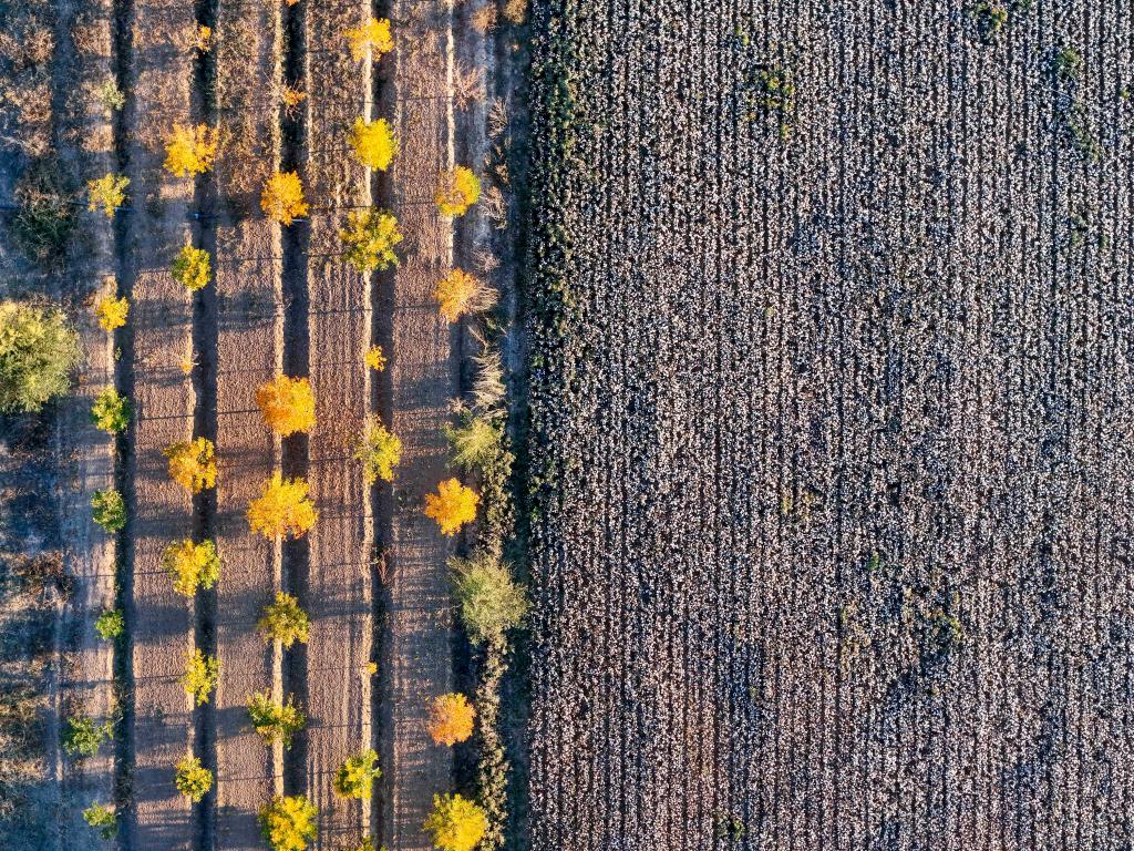 這是9月29日在新疆生産建設兵團第六師五家渠市拍攝的棉田和田邊林帶(9月29日攝,無人機照片)。