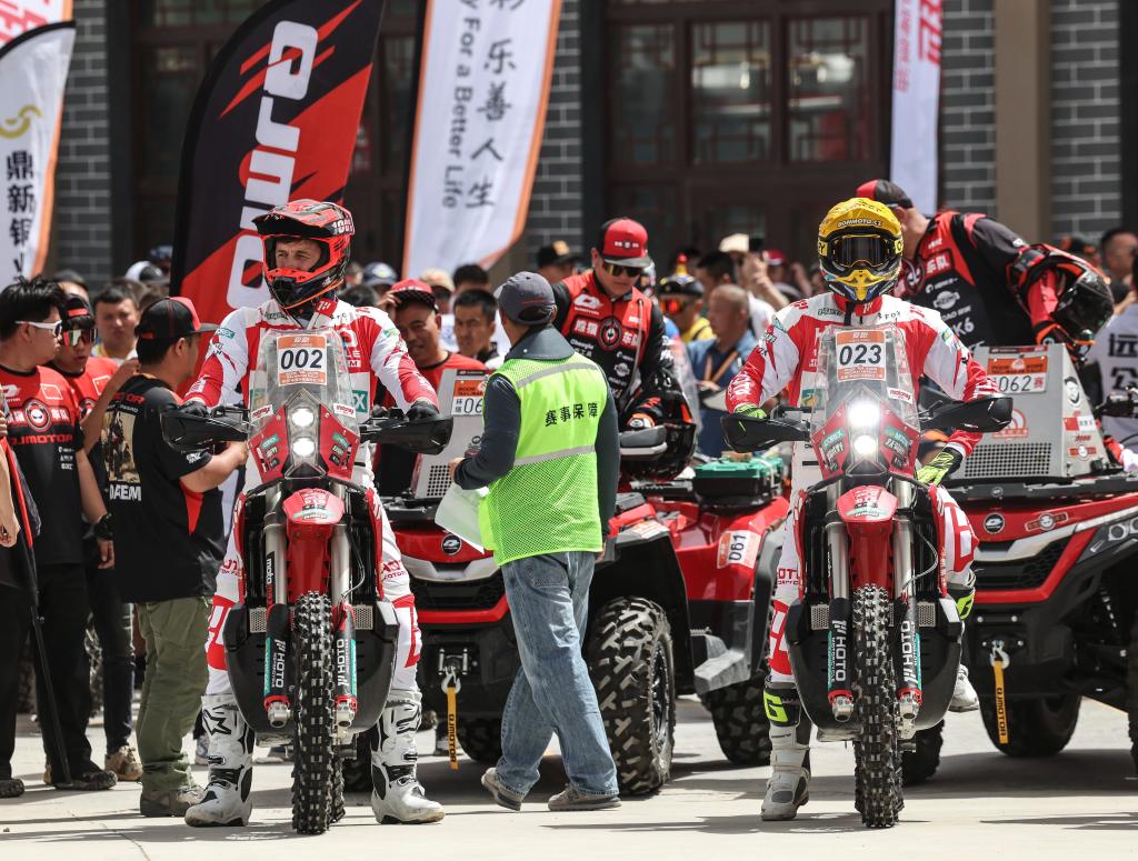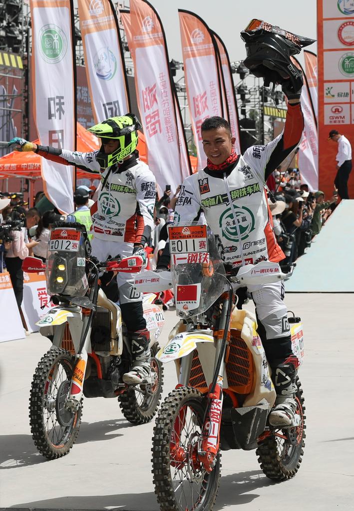 5月20日,寧夏南方商城雄鷹賽車隊車手宋昆、領航員付昕明在發車儀式上。