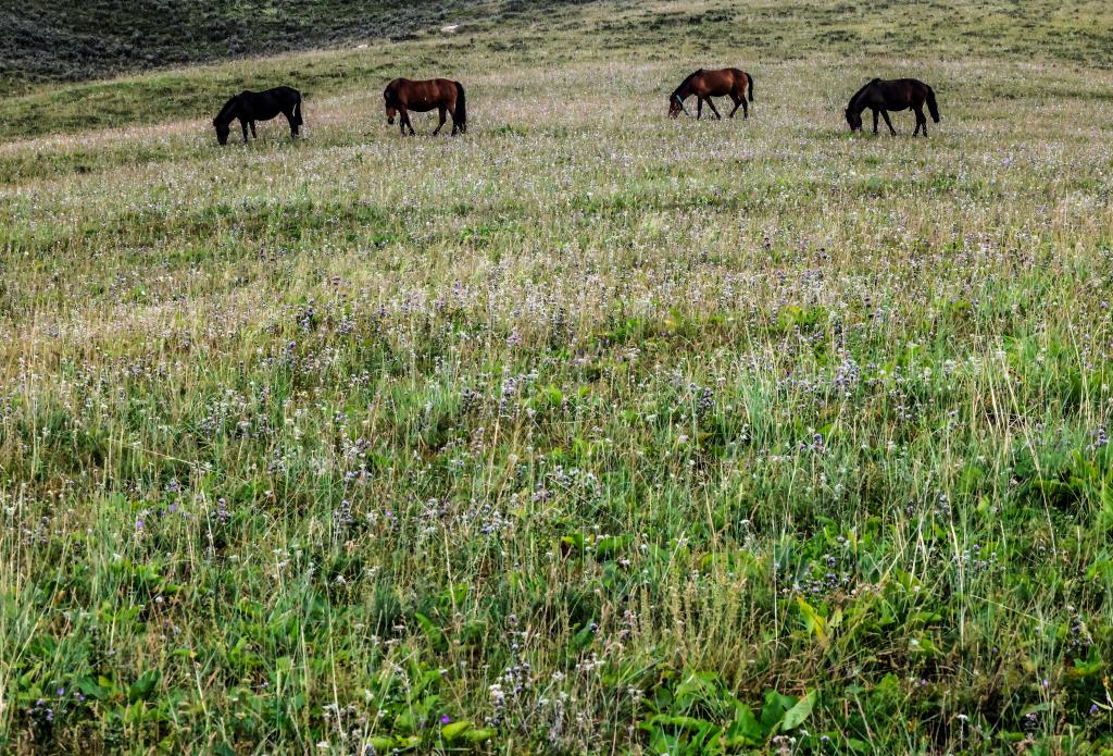 7月29日,馬在古爾圖南山景區悠閒吃草。