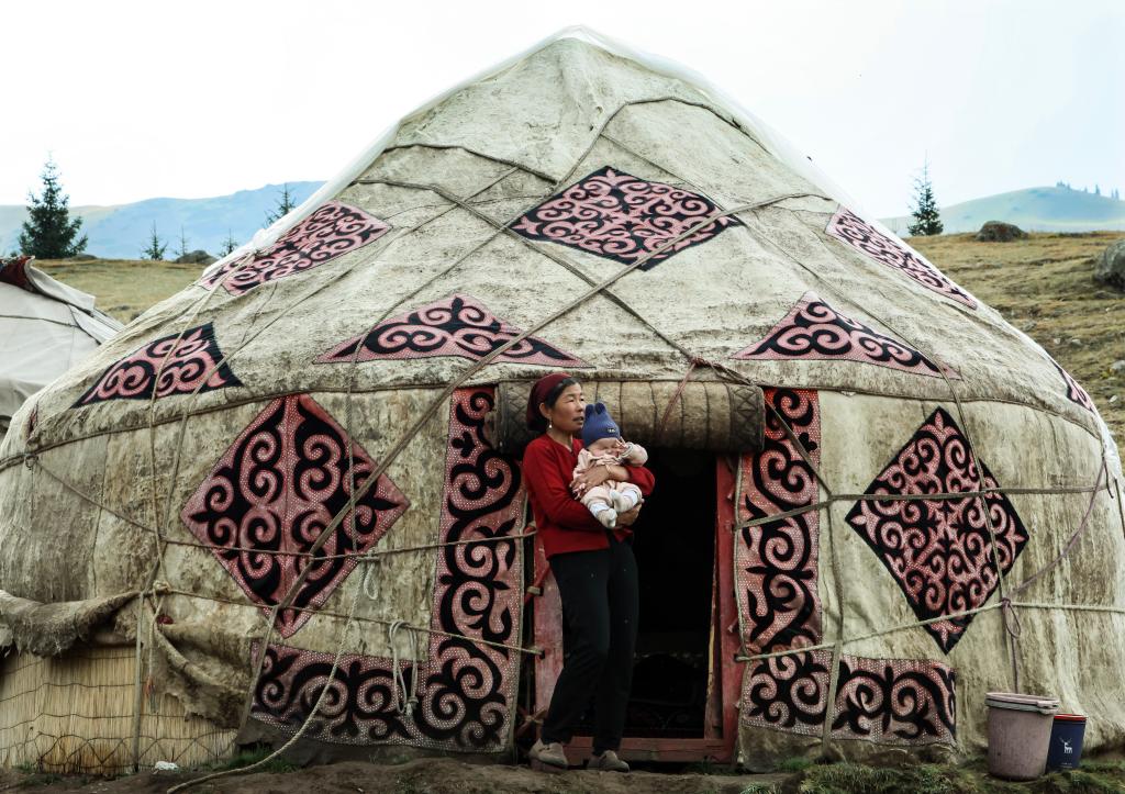7月29日,一位牧民抱着孩子在氈房門口張望。