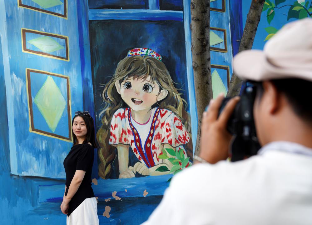 8月4日,在新疆伊犁哈薩克自治州伊寧市六星街,游客在一處塗鴉墻前留影。新華社記者 劉蓮芬 攝