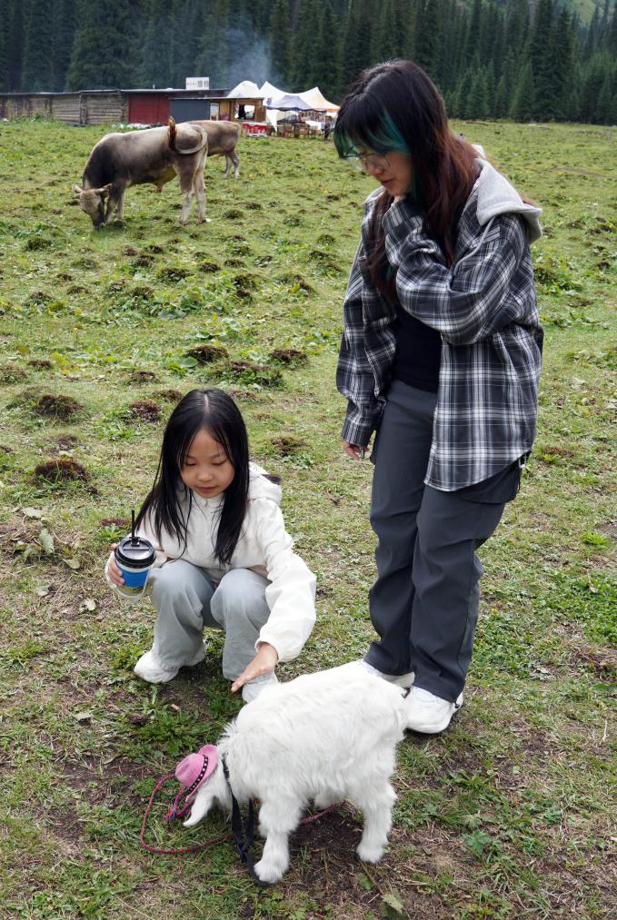 7月30日,在新疆伊犁哈薩克自治州昭蘇縣夏塔景區,游客與小動物互動。新華社記者 劉蓮芬 攝