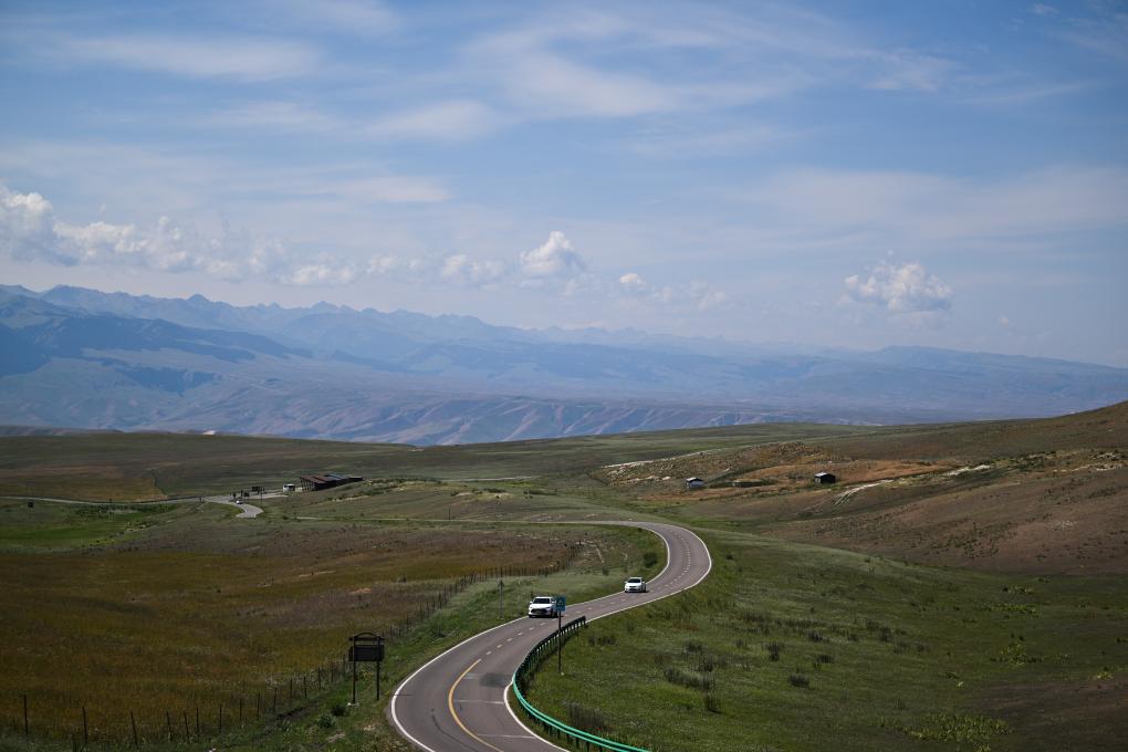 8月1日,車輛行駛在新疆伊犁哈薩克自治州特克斯縣喀拉峻草原的道路上。新華社記者 辛悅衛 攝