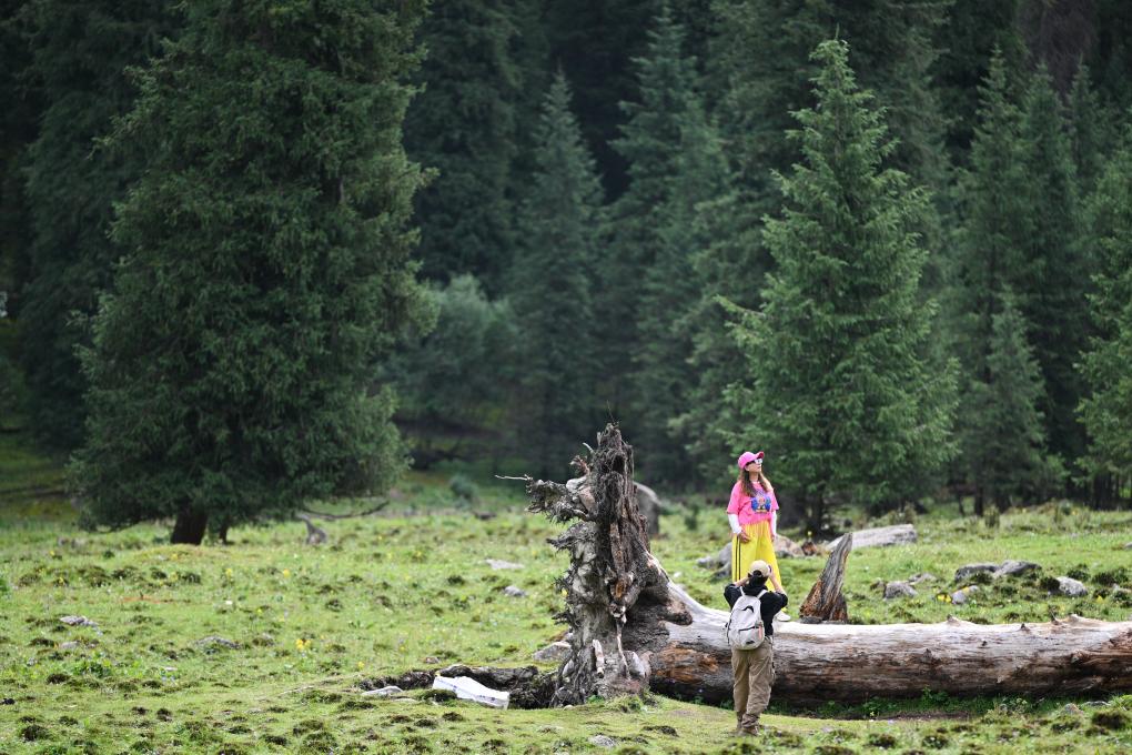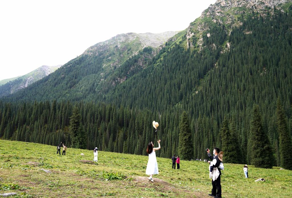 7月30日,游客在新疆伊犁哈薩克自治州昭蘇縣夏塔景區內留影。新華社記者 辛悅衛 攝