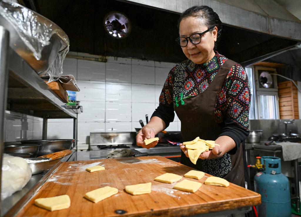 9月17日,馬秀花在製作哈薩克族傳統風味的包爾薩克。