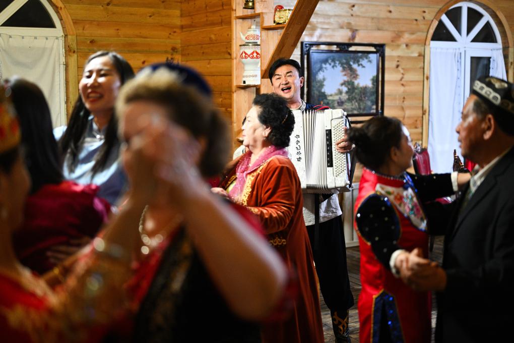 9月17日,哈薩克族客人哈加依甫·也克斯漢在餐後拉起手風琴,人們隨琴聲起舞。