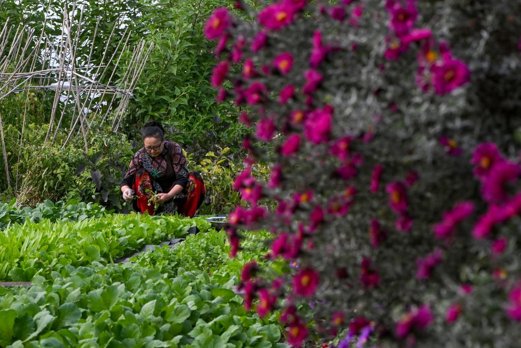 9月17日,馬秀花在菜園裏採摘薄荷,用於製作薄荷茶。
