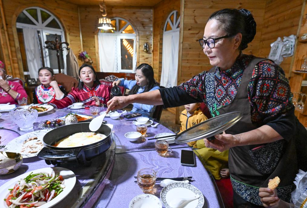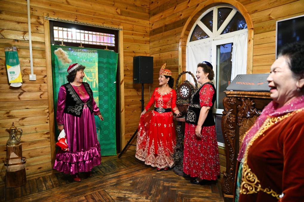 朋友們穿着民族服飾來到“朋友莊園”,馬大姐招呼大家進屋就坐。親朋好友拉着家常,品嘗着馬大姐的拿手菜和小院裏結的新鮮水果。房間裏飄揚起歡快的歌聲,不同民族的親友們在房間裏共舞。