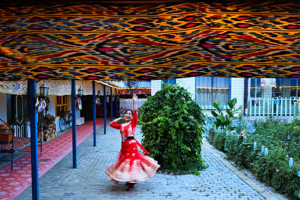 9月17日,哈薩克族客人庫爾加娜在院中跳舞。