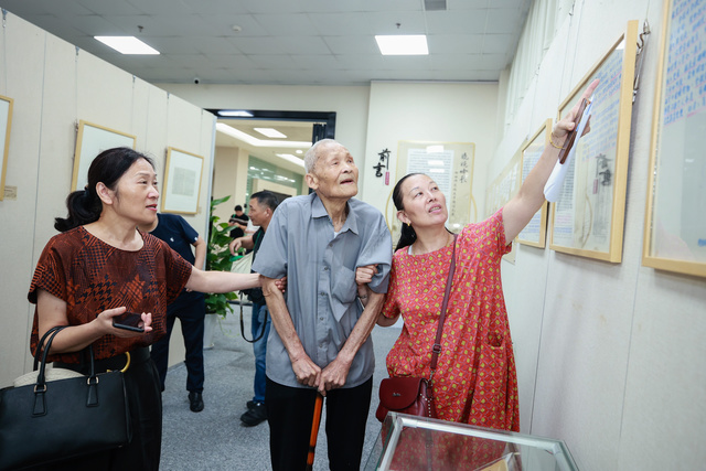 走進展廳,迎面是一張放大的湘湖師範老照片以及字跡斑駁的校牌,瞬間將時光拉回到上個世紀。現場年齡最大的校友沈雲來已94歲高齡,是1949屆校友、抗美援朝老兵。他與幾位校友一起,站在校牌邊唱起了難忘的《湘師校歌》:“波波相逐長滔滔,後波起伏前波導;人人相續長勞勞,後人生活前人教……不求相肖要相超,請看湘湖水、浙江潮!”