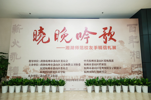 據悉,本次展覽以“曉晚吟歌”為題,是由於展覽內容主要聚焦於擔任了25年湘師校長的金海觀。金校長字曉晚,當年被師生親切地稱呼為“金師”或“晚師”。此次展出的手稿信札主要來自湘師1988屆虞萬鈞等湘師校友、金海觀長子金陵、《金海觀傳》作者蔣明炬和區知聯會、杭州科技職業技術學院等的捐贈。開幕式上為捐贈者代表頒發了捐贈證書,舉行了《曉晚吟歌——湘湖師範校友手稿選》贈書儀式。