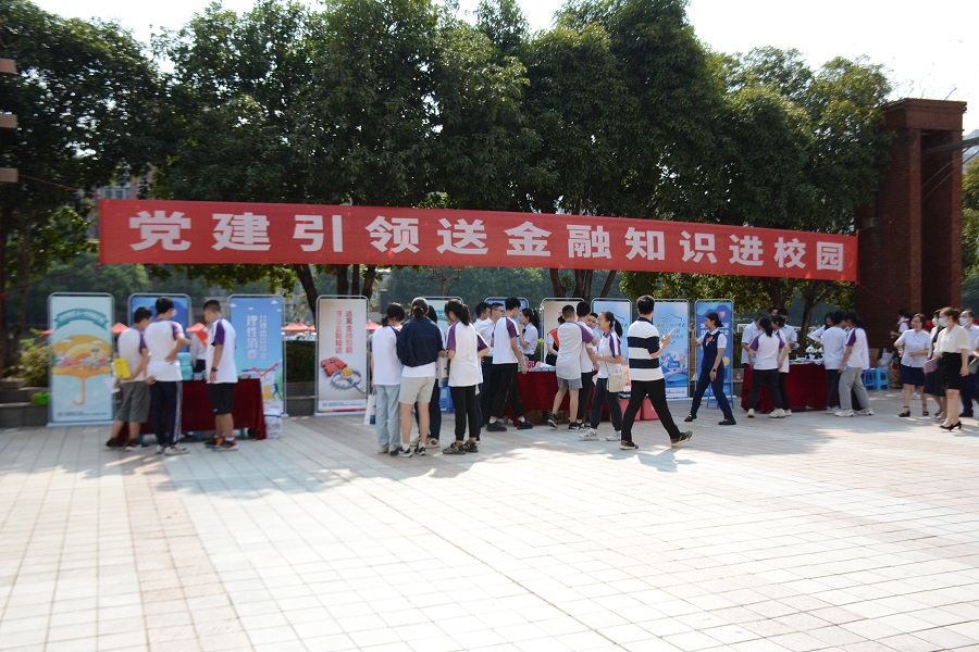 現場,黨員先鋒隊通過現場授課、發放宣傳折頁、線上平台推送等形式,開展了金融知識教育宣傳活動。例如,向全校各班級播放6分鐘中學生金融知識宣傳視頻;三位金融機構代表向高二年級100名學生就中學生金融知識及風險防範進行授課;黨員先鋒隊在校園景觀大道上設立宣傳站點,向學生們派發宣傳資料、小禮品等,並現場答疑解惑。當天活動結束後,魯能巴蜀中學官網及公眾號APP、家長微信群均發布金融知識宣傳活動視頻、文字等。