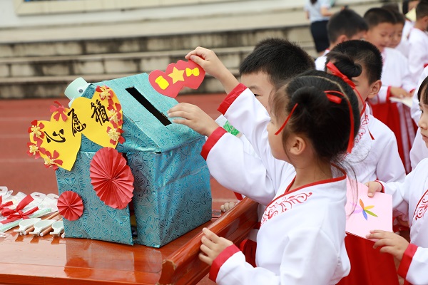 本次“遇見三香遇見你”入學儀式課程分“邁進三香門”“開啟三香路”“爭做三香娃”三個篇章。學生們在老師們的帶領下,身穿漢服、許下心願、開筆啟蒙。學校教師團隊也通過“硃砂啟智”“范寫人字”“贈送入學禮物”等活動,幫助孩子們樹立“我是小學生”的責任意識、奮鬥意識,鼓勵孩子們從一年級就努力做一個“習慣良好、喜愛閱讀、多才多藝”的新時代好少年。