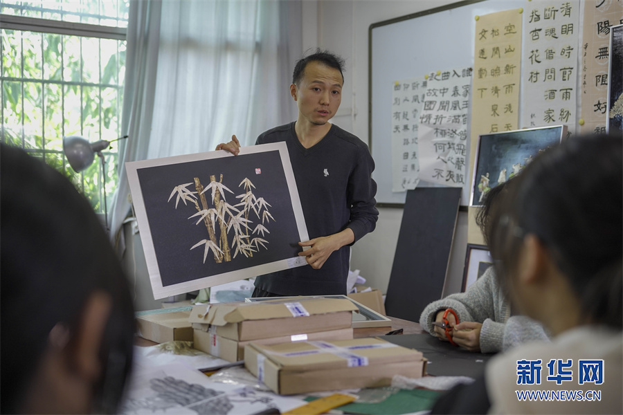 在學校的筍殼畫教室裏,李思飛在指導同學們利用筍殼作畫。新華網 彭博 攝