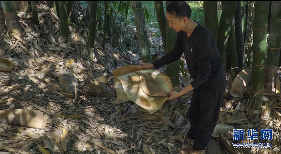 李思飛在竹林中撿拾筍殼。新華網發(熊鵬 攝)