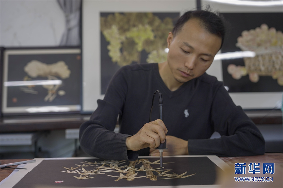 李思飛在利用筍殼作畫。新華網發(熊鵬 攝)