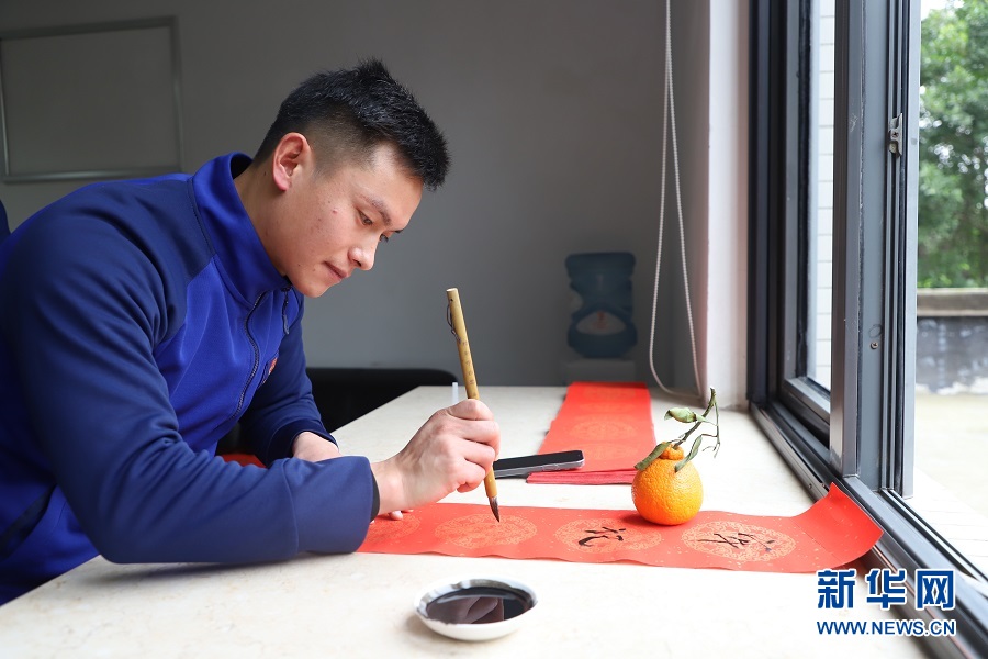 春節期間,重慶市新招錄消防員入職教育訓練大隊(以下簡稱新訓大隊)開展了一系列“年味兒”十足的春節活動,讓參加新訓的300名消防“新藍”感受春節氛圍。圖為消防員正在寫春聯。新華網發(黃華 攝)
