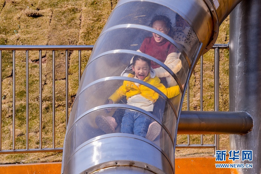 中梁山礦山公園兒童樂園內,孩子們正在玩滑梯。新華網發(曹鳴鷗 攝)