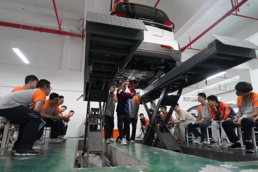 9月12日,在重慶市北碚區職業教育中心新能源汽修實訓室,教師(中)在給學生講解新能源汽車維修知識。新華社發(秦廷富 攝)
