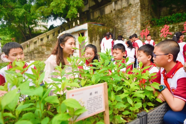 在該校神農草堂中藥種植園,重慶市綦江區中醫院醫務人員通過情景劇的形式,以紅軍當年長征時期用中草藥療傷的故事,帶領該校的同學們認識中醫中藥。