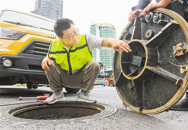 江北區北城天街,工作人員打開智能井蓋,查看其背部的智能密碼鎖、機械密碼鎖和傳感器等裝置。(攝於2023年10月9日)記者 張錦輝 攝/視覺重慶