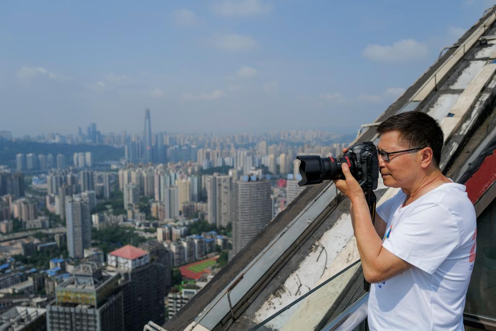 6月18日,參加活動的攝影愛好者在重慶江北區觀音橋商圈一棟高層建築的頂樓拍攝城市風光。