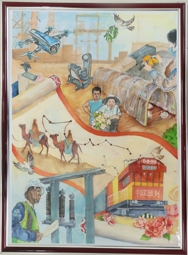 作品名稱:繪畫《技能合作熱絡“一帶一路” 共同發展擘畫“絲路畫卷”》