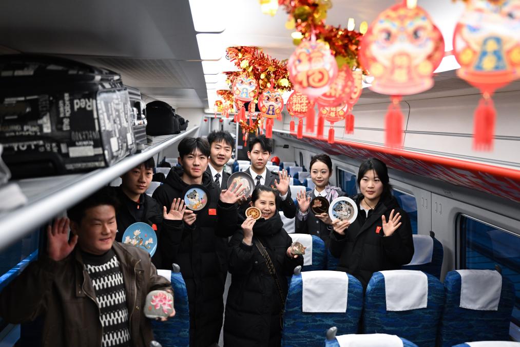 中國鐵路西安局集團有限公司西安客運段等鐵路單位聯合開展“金蛇迎春文化送祝福 高鐵先鋒溫暖回家路”活動。在由西安北開至香港西九龍的G828次列車上,列車工作人員用中國結、福字、春聯等裝飾品,為車廂營造出濃厚春節氛圍。