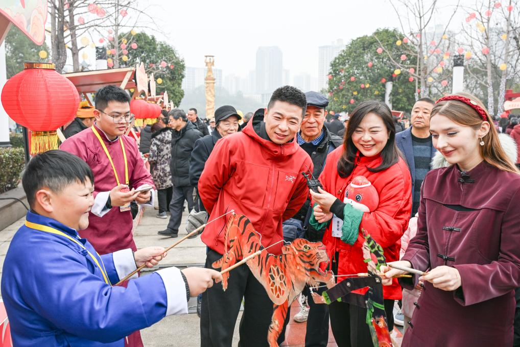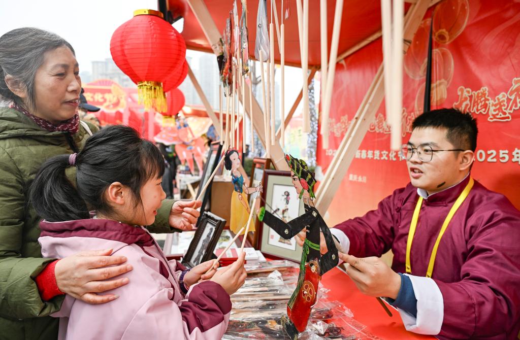 1月16日,游客在2025年川渝新春年貨文化節上體驗皮影戲。