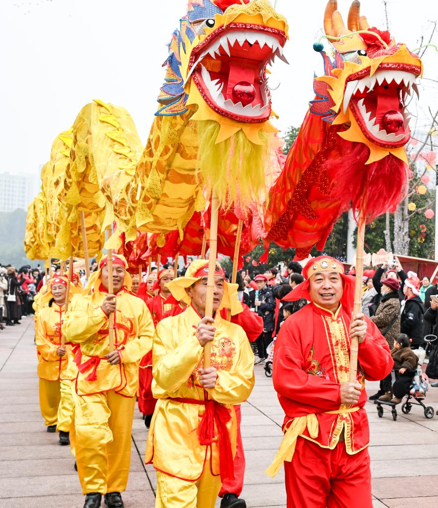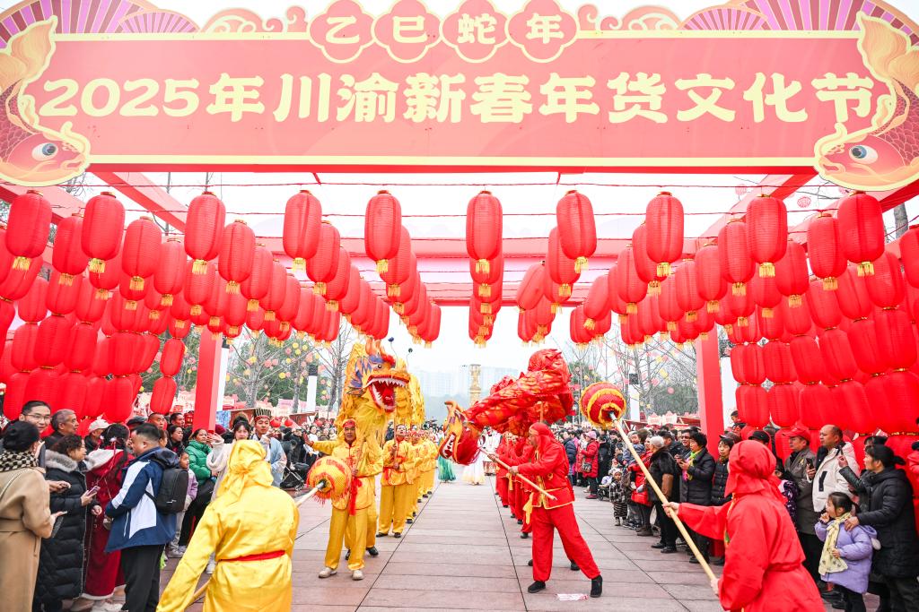 這是1月16日在2025年川渝新春年貨文化節上拍攝的舞龍表演。