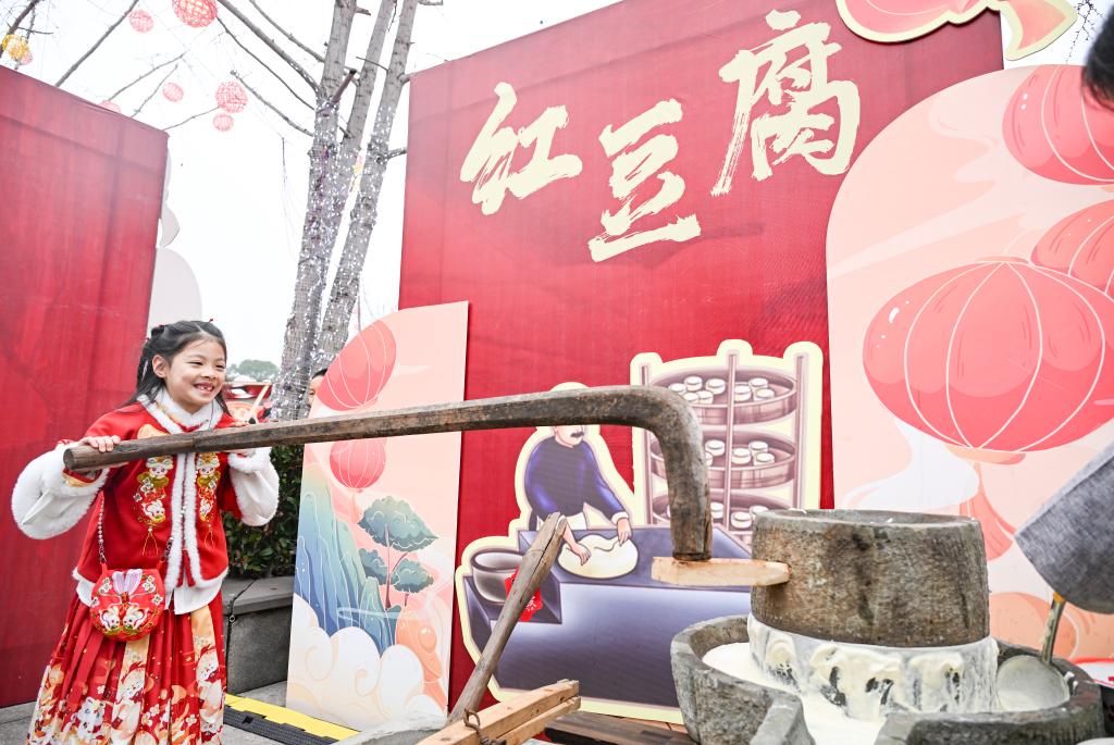 1月16日,一名小女孩在2025年川渝新春年貨文化節上體驗紅豆腐製作。