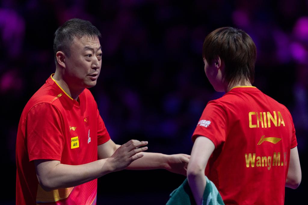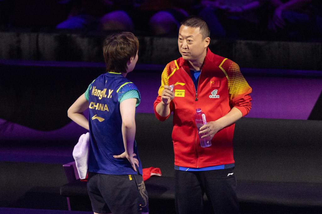 3月14日,教練馬琳(左)在比賽間隙指導王曼昱。