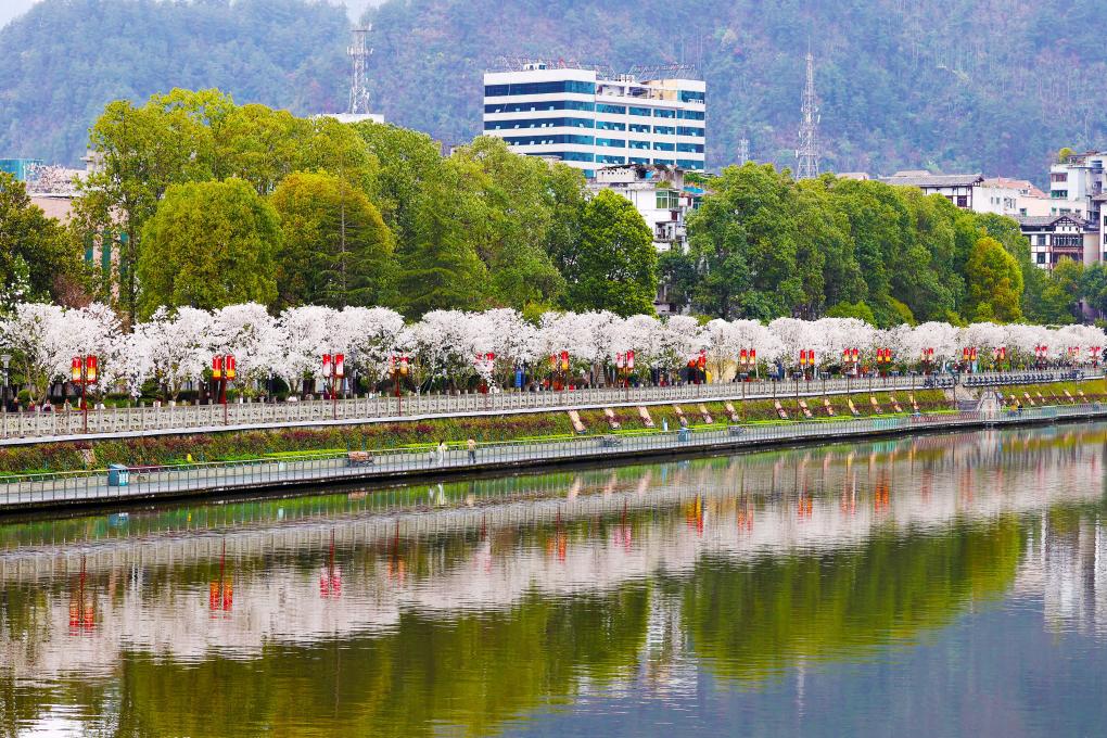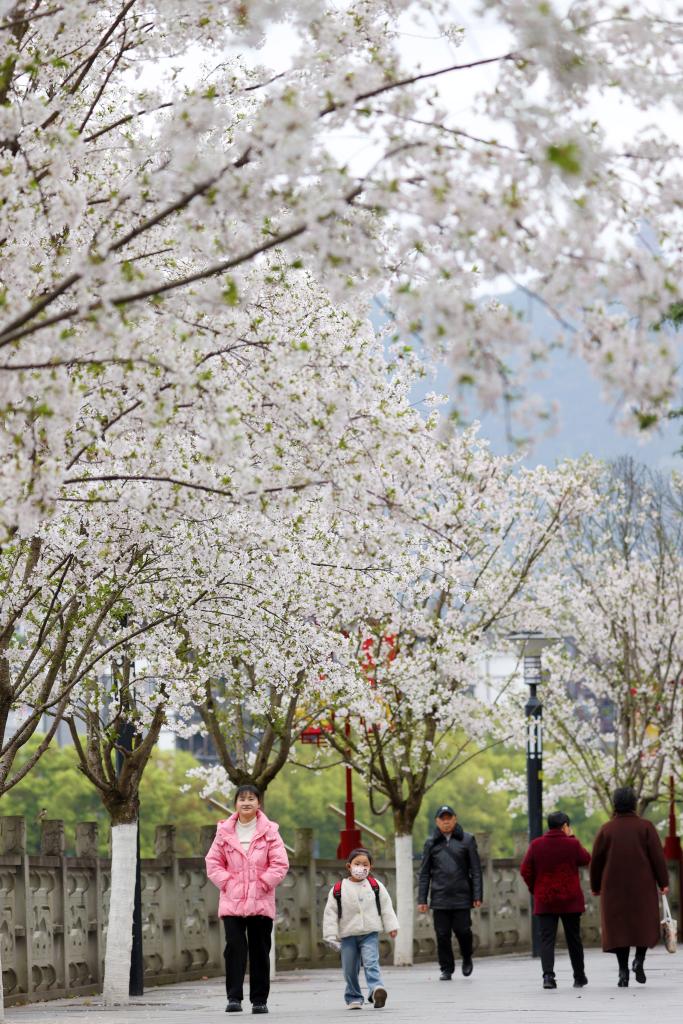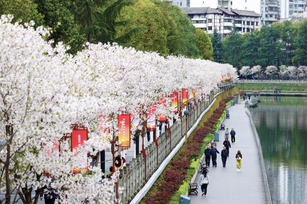 近日,重慶市黔江區武陵水岸櫻花長廊的櫻花盛開,吸引眾多市民前來賞花,感受春天的美麗。近年來,黔江區強化城市園林綠化建設,打造生態與建築、人文與自然相得益彰的優美環境,提升城區景觀顏值和市民生活質量。