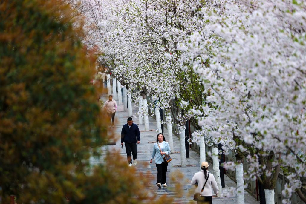 3月28日,市民在重慶市黔江區武陵水岸櫻花長廊散步賞花。