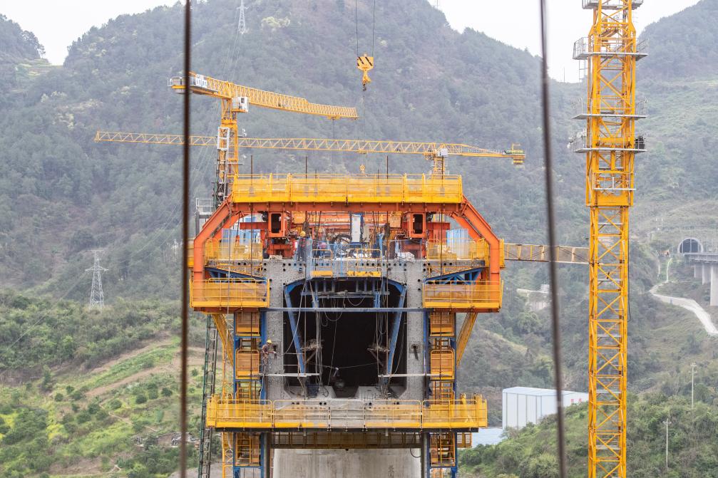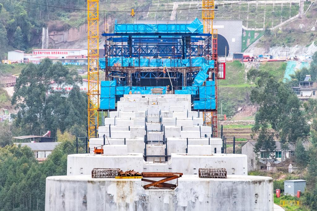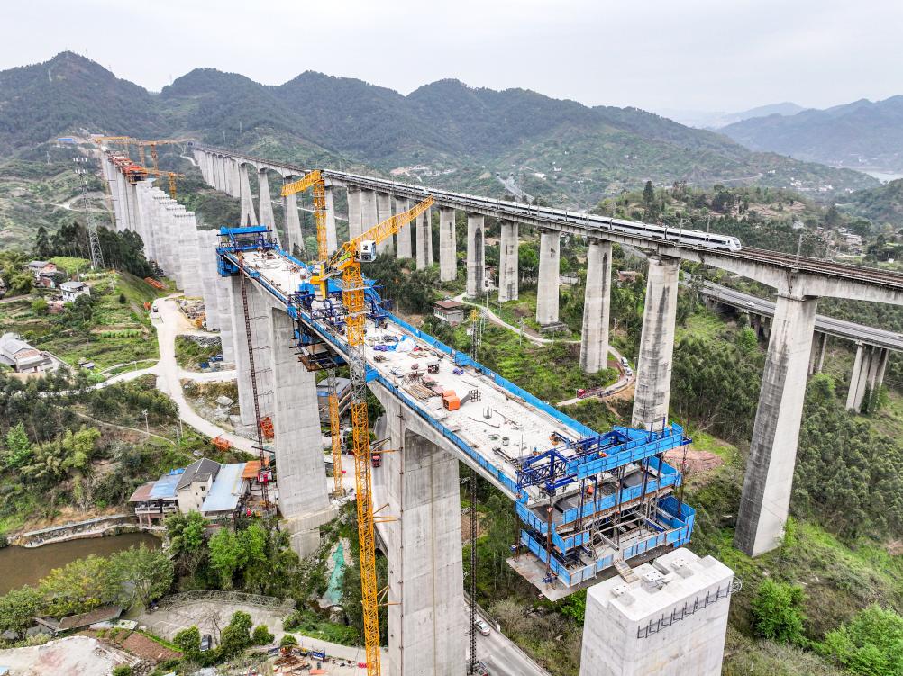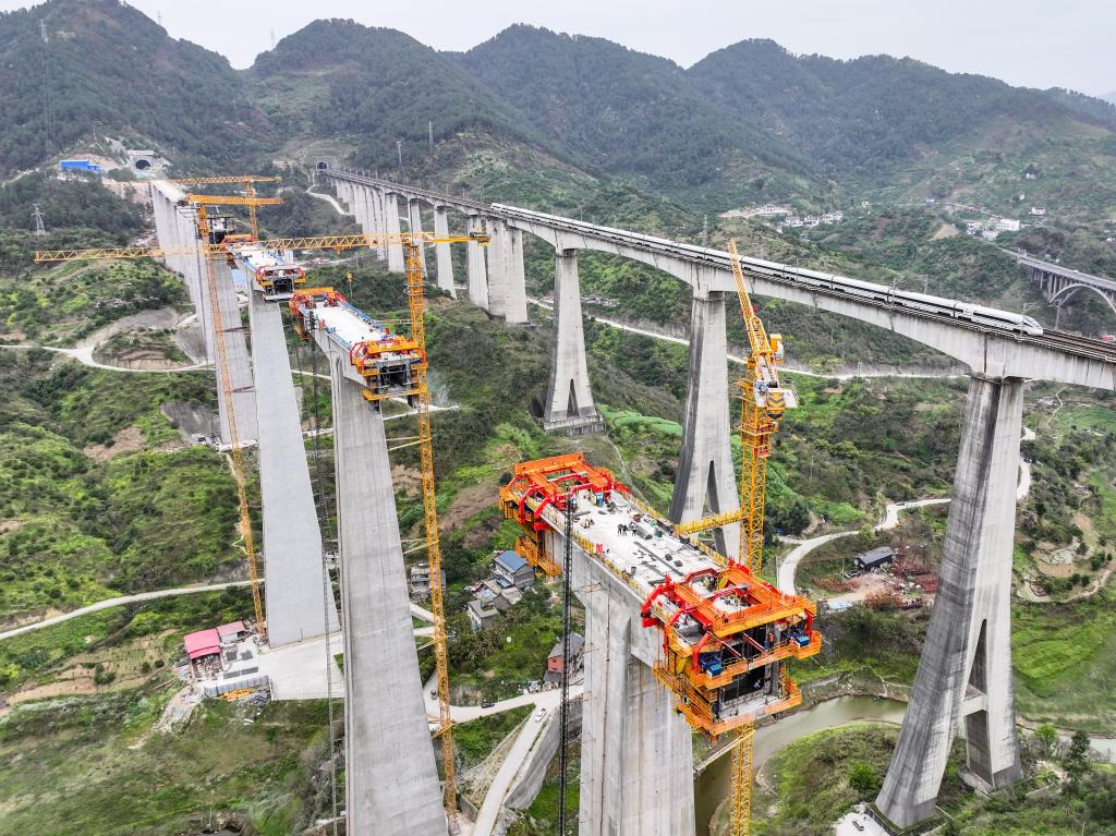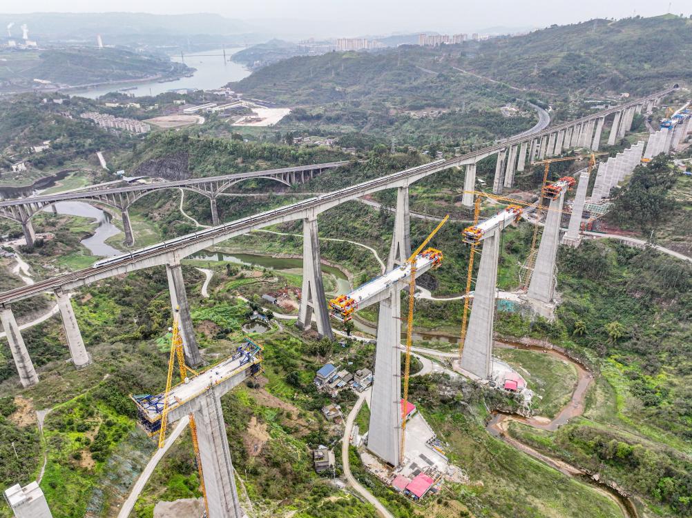目前,中國鐵建大橋局承建的渝萬高鐵蔡家溝雙線特大橋建設穩步推進。 蔡家溝雙線特大橋位於渝萬高鐵重慶市涪陵區境內,橋長2113.3米,最高主墩為150.5米,為渝萬高鐵全線最高墩。 渝萬高鐵是國家“八縱八橫”高鐵網包(銀)海、京昆通道的組成部分。項目建成通車後,將加強渝東北三峽庫區城鎮群和主城都市區的便捷&&,極大地便利沿線群眾出行,促進沿線經濟社會發展。 新華社記者 唐奕 攝